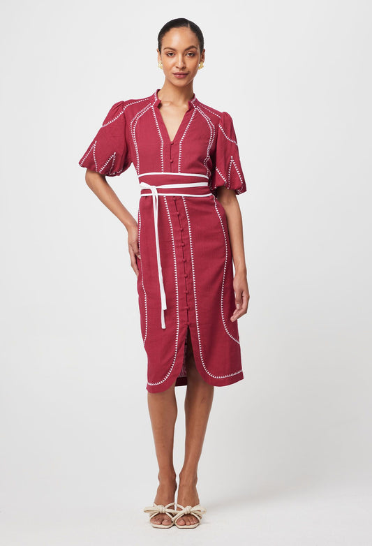 Once Was - Carlyle Embroidered Linen Viscose Dress - Crimson