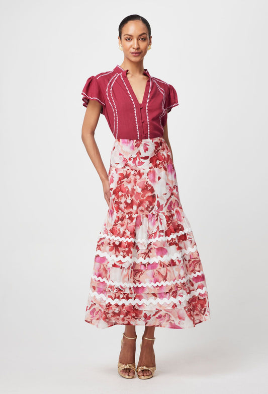 Once Was - Carlyle Embroidered Linen Viscose Top - Crimson