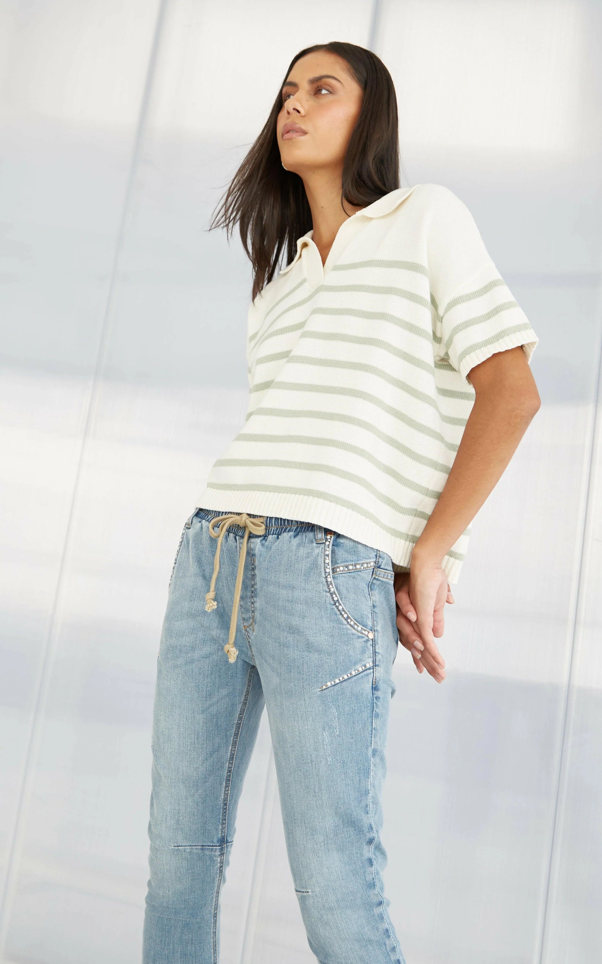 A mid-rise and cropped length in a Sunbleach Wash with Lustrous Pearl Embellishments, complete with an elasticated waistband and sportive drawstring. These stretch denim jeans have a flattering arch shape leg which sits at the hip for a relaxed look.