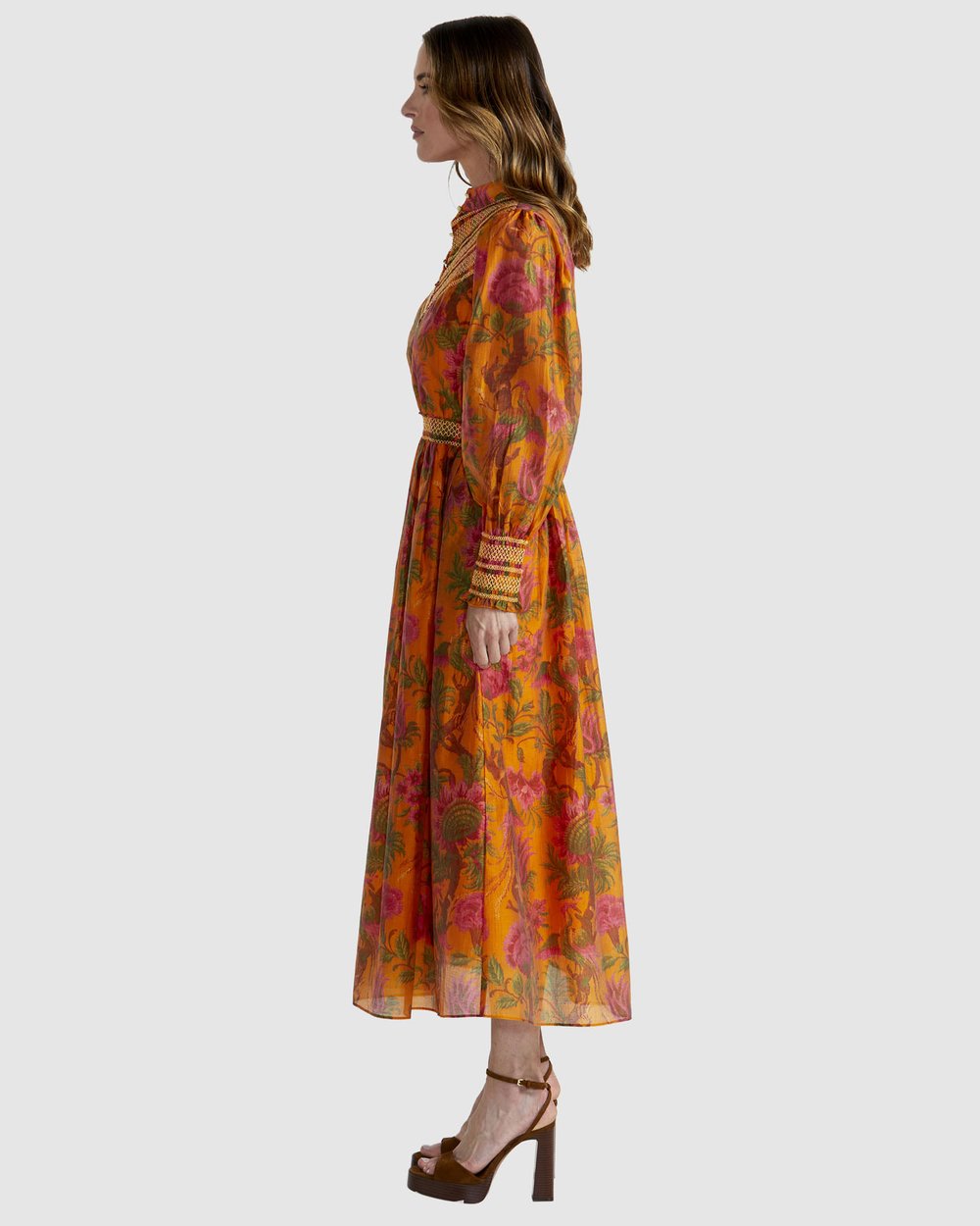 The Panama Dress boasts an elastic shirring detail at the neckline and waist for a chic, flattering fit. A button opening at the centre front and full skirt complete this sophisticated, polished piece. Its classic design is perfect for winter occasions, offering timeless elegance.