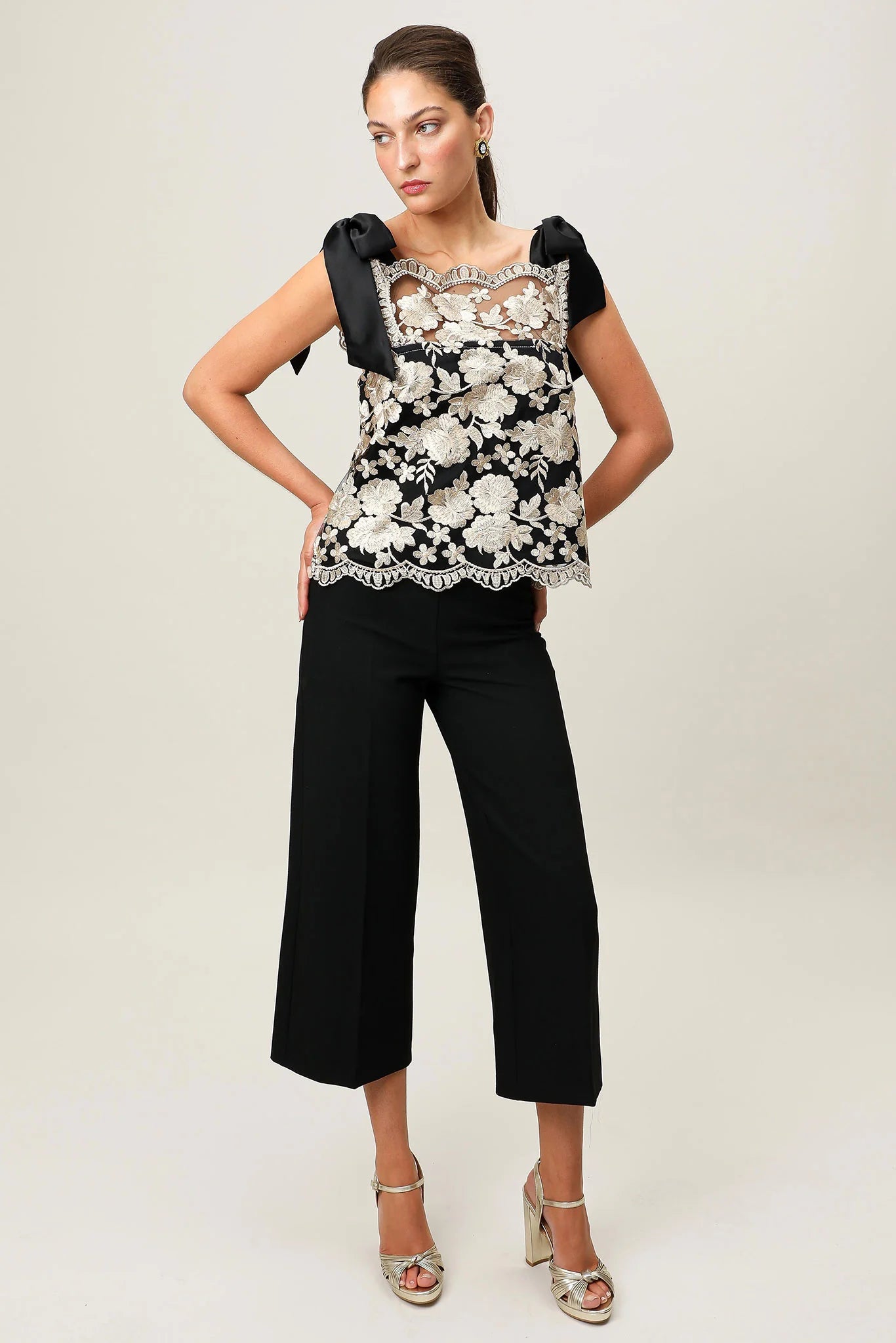 The Saint Ray Lace Top introduces a sense of quiet opulence to everyday dressing. Crafted from a delicately structured base, featuring intricate gold lurex floral embroidery layered over sheer mesh, framed by scalloped lace finishing. Soft satin adjustable shoulder bow straps complete the design, designed a boxy silhouette. The interplay of texture and transparency creates depth, while the floral motif brings a timeless romanticism to the piece.
