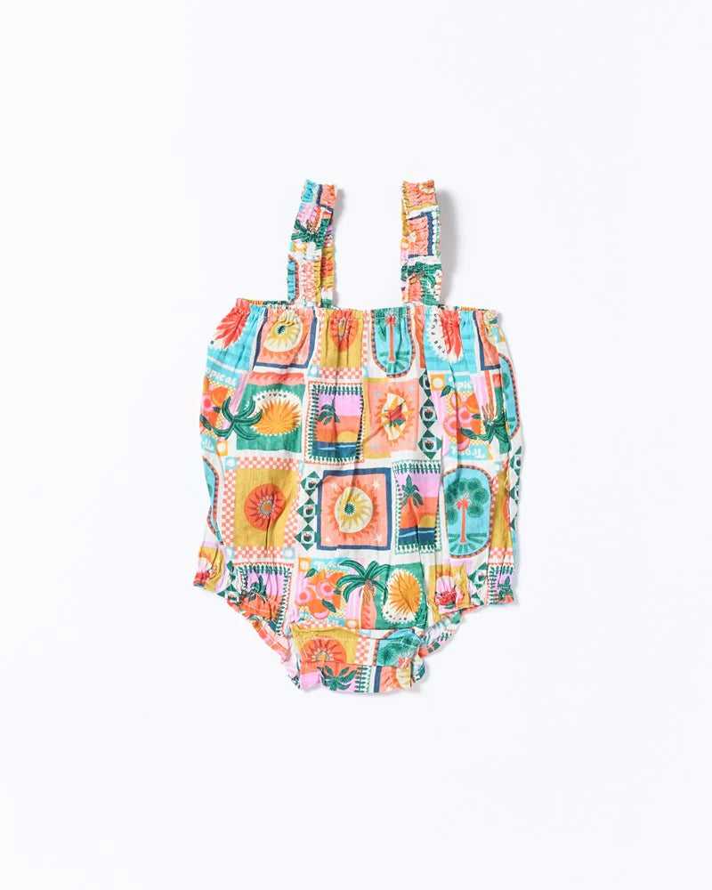 Say hello to the ultimate summer romper! The Meadow Romper in Spicy Summer is bursting with colour and joy, thanks to its retro-inspired tile print and playful tropical icons. Designed with stretchy shirred straps and soft elastic through the chest and legs, it’s made for warm days, wiggly babes, and beachside giggles.